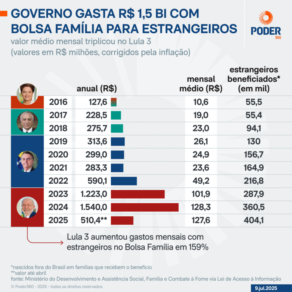 BRASIL, 04 de novembro de 2025 – O governo federal pagou R$ 1,5 bilhão do Bolsa Família em 2024 a pessoas nascidas fora do Brasil, segundo dados obtidos pelo Poder360 por meio da LAI (Lei de Acesso à Informação).