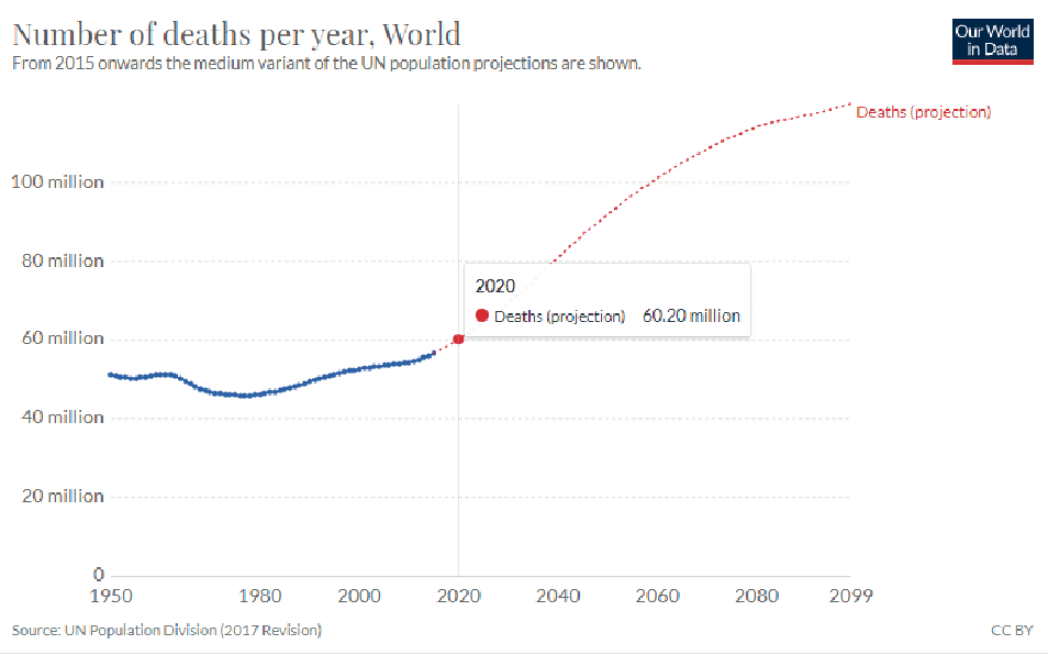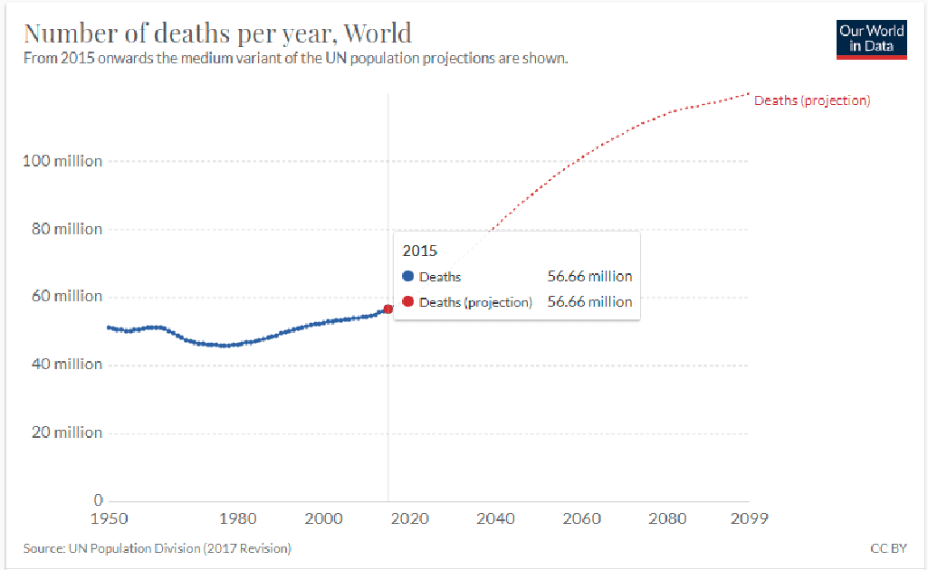 Porque se ele tivesse consultado as estatísticas da própria ONU, da OMS, e do CDC americano sobre o número de mortes anuais (por todas as causas) no mundo, ele teria enxergado que o número tem variado de 50 a 60 milhões de mortes por ano desde 1950 até os dias de hoje (vide gráficos abaixo14); e teria verificado que entre 2% à 3% desse total tem sido, desde então, atribuído a mortes por Influenza A, sem diferenciar se foi por H1N1, H5N1, ou por qualquer outra variação genética. Enfim, o número de mortes atribuídas a infecções por “Influenza A” totalizaria algo entre 1.200.000 e 1.800.000 mortes/ano, ou seja, divididos por 365 dias, seriam entre 3287 e 4931 mortes por dia, todos os dias do ano!