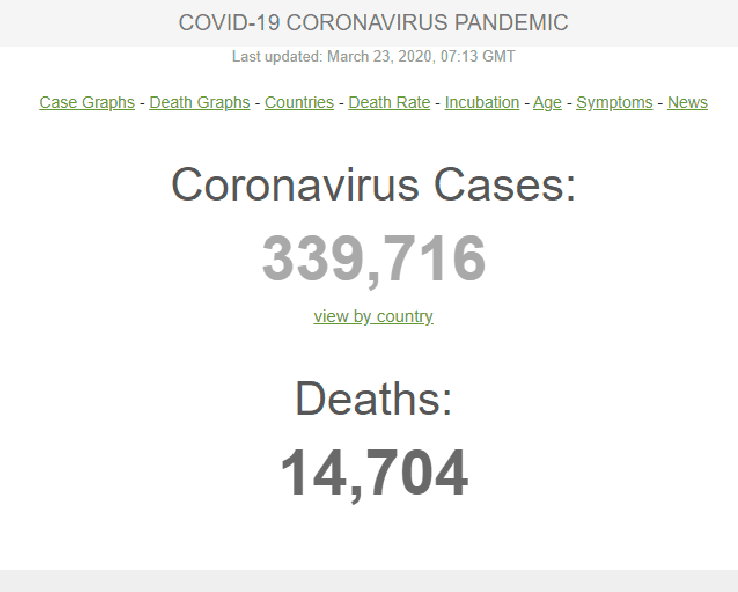 Segundo a organização worldometers.info15. O número total de mortes no mundo atribuídas16 ao “CoVid-19”, ou seja, ao vírus da Influenza A, está sendo computado desde 22 de janeiro deste ano, e até o dia de hoje, 23/03/2020, foram contabilizadas 14.704 mortes em 60 dias.