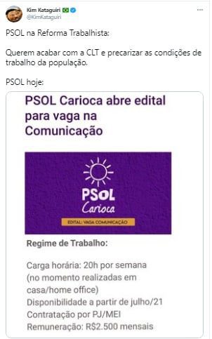 “PSOL é o partido mais coerente do Brasil. Afinal de contas, eles mantém a mesma postura hipócrita de sempre”, debochou […] Os caras contratam por MEI porque sabem que a CLT é horrível. É bizarro demais eles votarem contra a reforma trabalhista, pedirem mais Estado nas relações trabalhistas e ao mesmo tempo fugirem de todo esse mar regulatório que eles apoiam. A mensagem é clara: PJ para mim, CLT para vocês; mais liberdade para mim, mais Estado para vocês. O golpe tá aí, cai quem quer!”, publicou Alexandre Freitas (NOVO,RJ), deputado estadual, em seu Twitter.