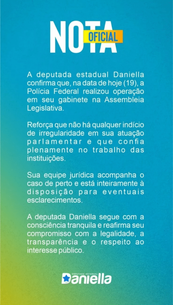 Na oportunidade, a deputada estadual Daniella Gentil negou qualquer irregularidade através de uma nota em suas redes sociais. Ela afirmou confiar nas instituições e destacou que sua equipe jurídica prestará os esclarecimentos necessários.