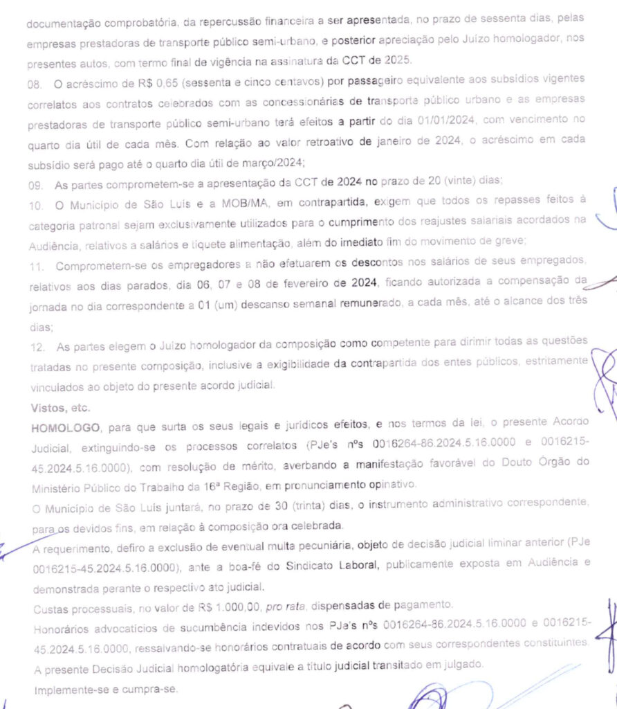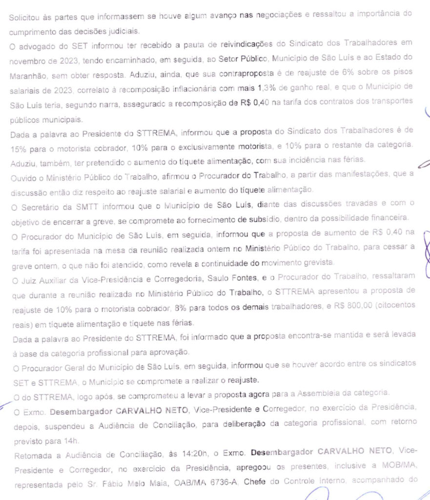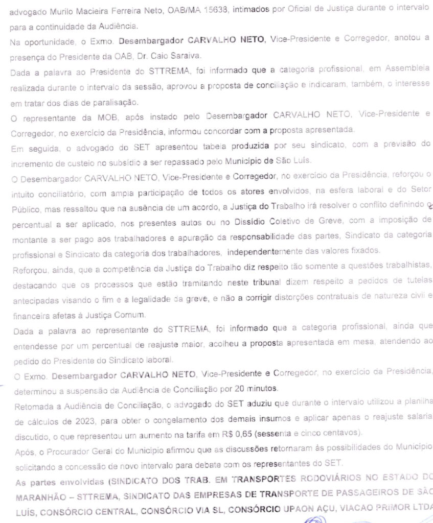 Durante a última mediação realizada no TRT-MA, a Prefeitura comprometeu-se, por escrito, a realizar os repasses do subsídio de forma regular. A ata da reunião também determinou que todos os valores recebidos pelas empresas fossem destinados exclusivamente ao pagamento de reajustes salariais e do vale-alimentação dos trabalhadores.