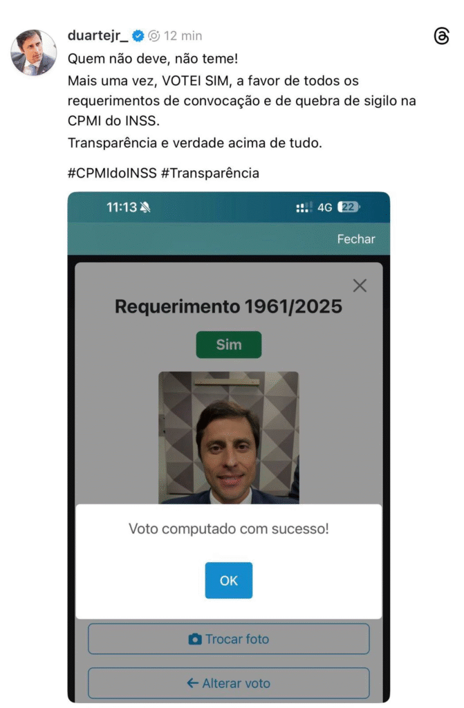 “Quem não deve, não teme. Votei sim a todos os requerimentos de convocação e de quebra de sigilo na CPMI do INSS. Transparência e verdade acima de tudo”, escreveu o parlamentar.
