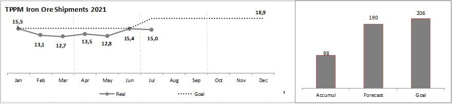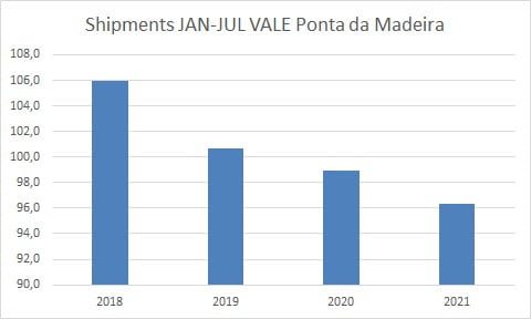 A empresa tem um atraso acumulado de 14 milhões de toneladas em relação à meta estabelecida para 2021 de 206 milhões de toneladas. Os embarques acumulados no final de julho foram os menores em 4 anos.