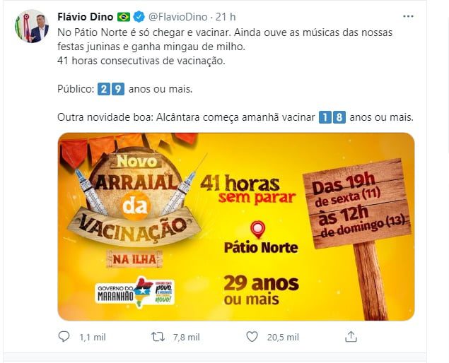 Nesta quinta-feira (10), o governador do Maranhão, Flávio Dino (PCdoB), divulgou que o “Arraial de Vacinação” tem como público alvo pessoas com 29 anos de idade ou mais, o espaço contará com músicas de festas juninas e entrega de mingau de milho.