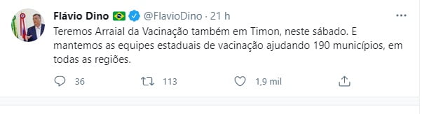 Além disso, anunciou que, a partir desta sexta-feira (11), o município de Alcântara irá imunizar o público com 18 anos ou mais, assim como ocorrerá vacinação em Timon a partir de sábado.