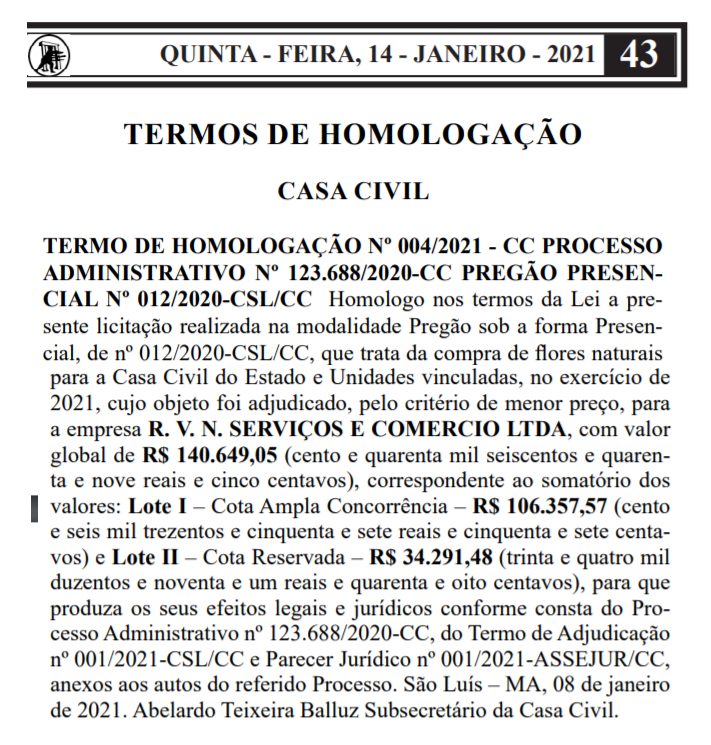 O Diário Oficial do dia 14 de janeiro de 2021 traz a homologação de um pregão presencial, no mínimo, curioso. O documento atesta que o governo de Flávio Dino irá gastar R$ 140.649,05 para adquirir “flores naturais”. A secretaria responsável pelo pedido é a Casa Civil, ligada diretamente ao governador. A empresa responsável pelo pedido será a R.V.N. Serviços e Comércio Ltda.