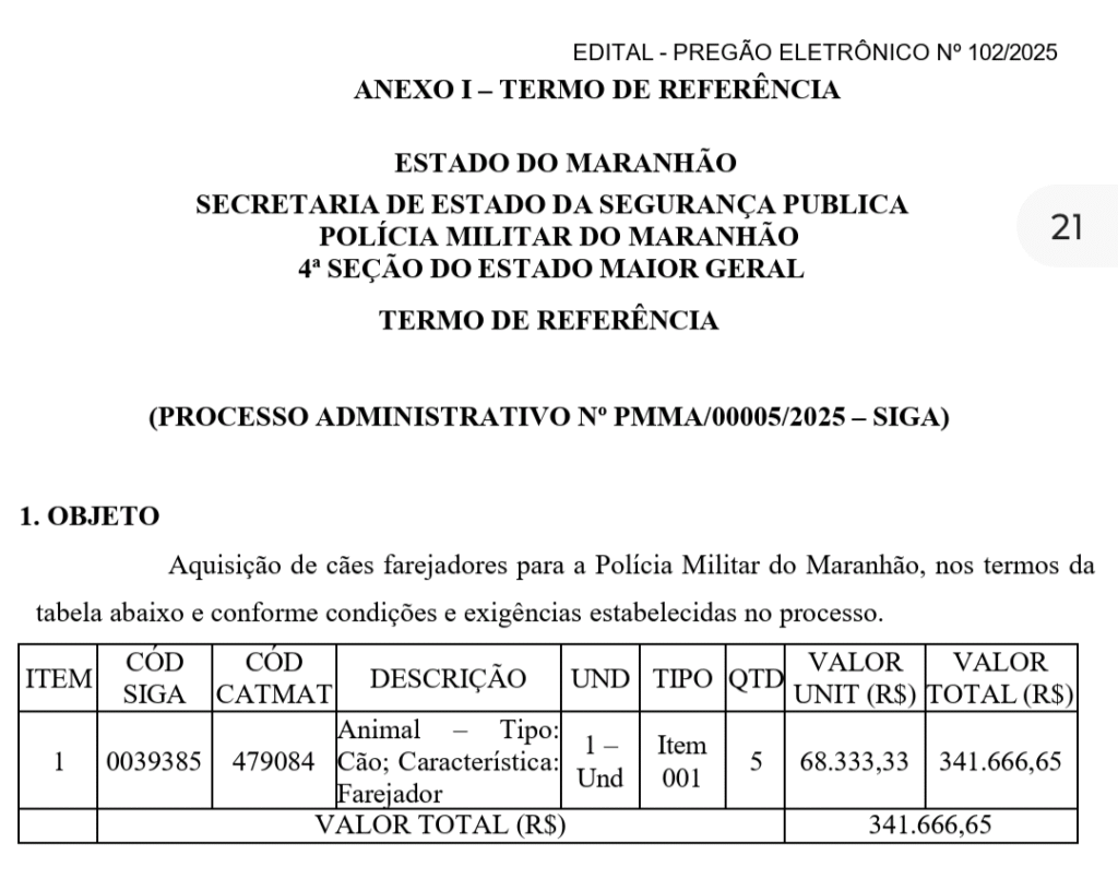 MARANHÃO, 02 de setembro de 2025 – O Governo do Maranhão, por meio da Secretaria de Estado da Administração (SEAD), abriu licitação no valor de R$ 341.666,65 para adquirir cinco cães farejadores. Os animais serão empregados pela Polícia Militar em operações de combate à criminalidade, com foco principal na repressão ao tráfico de entorpecentes.