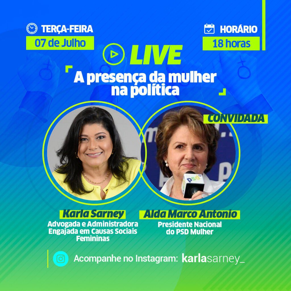 A engenheira Alda Marco Antônio e a advogada Karla Sarney, ambas filiadas ao PSD, realizam hoje live em que devem tratar da participação da mulher na política. Alda foi muito próxima do constituinte Ulysses Guimarães, que a incentivou a fundar a Comissão de Mulheres do MDB.