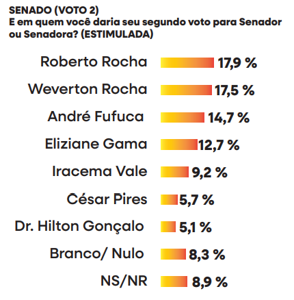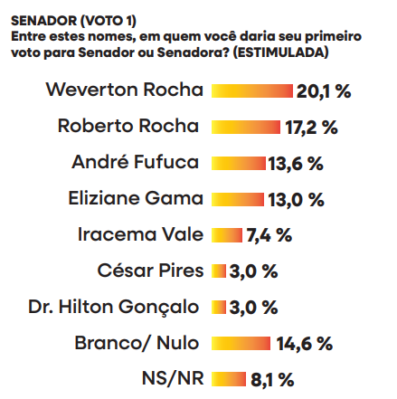 Para a primeira vaga no Senado, Iracema Vale obteve 7,4% da preferência dos entrevistados na pesquisa. Esse percentual superou os índices de outros nomes que há meses se posicionam como pré-candidatos, como o ex-prefeito Hilton Gonçalo e o ex-deputado estadual César Pires, ambos com 3,0%.