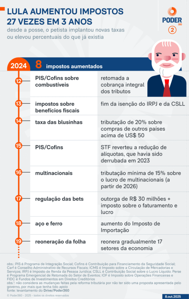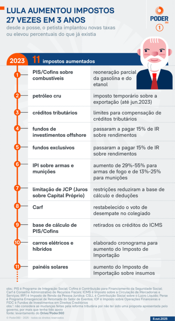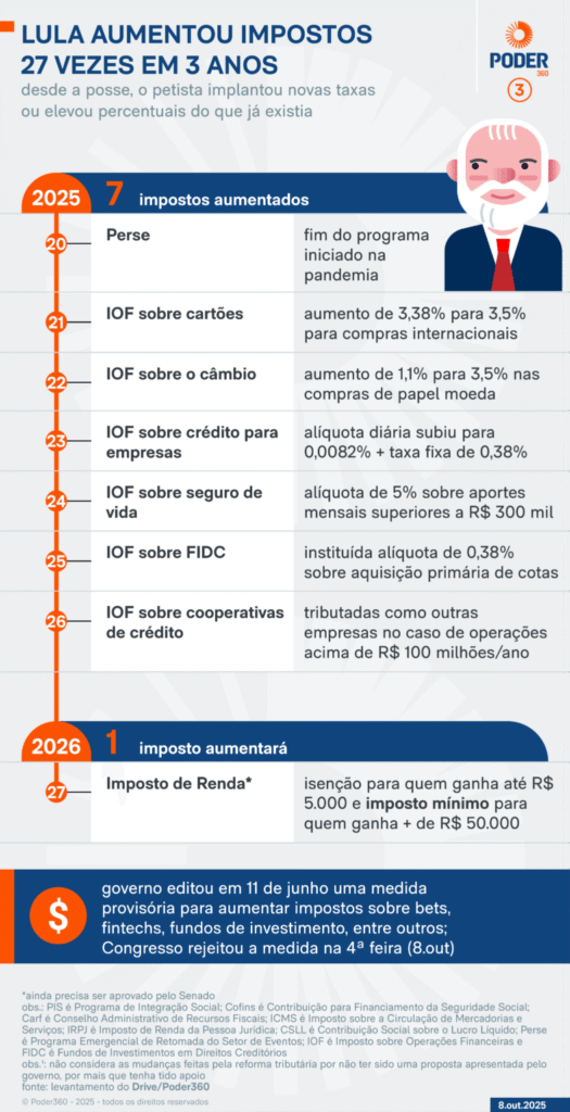 BRASIL, 9 de outubro de 2025 – O governo Lula (PT) adotou medidas que resultaram em aumento de impostos de diferentes setores da economia ao menos 27 vezes desde 2023, quando o petista assumiu o Planalto pela 3ª vez.