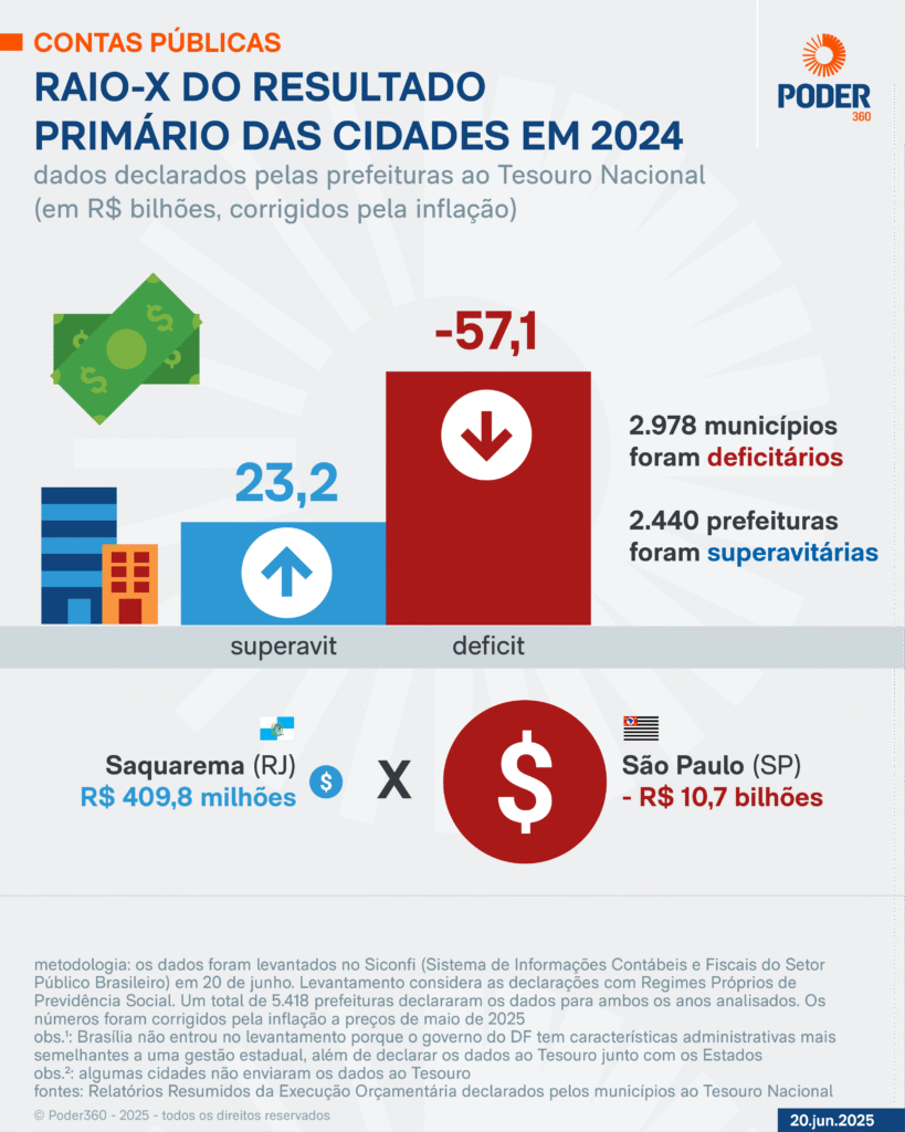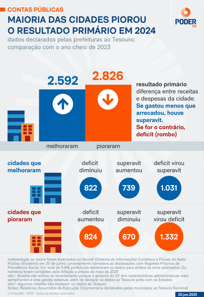 BRASIL, 23 de junho de 2025 – Um total de 2.826 prefeituras apresentaram piora no resultado primário em 2024 na comparação com o ano anterior, representando 52% das cidades analisadas em levantamento do Poder360 com base em dados declarados ao Tesouro Nacional.