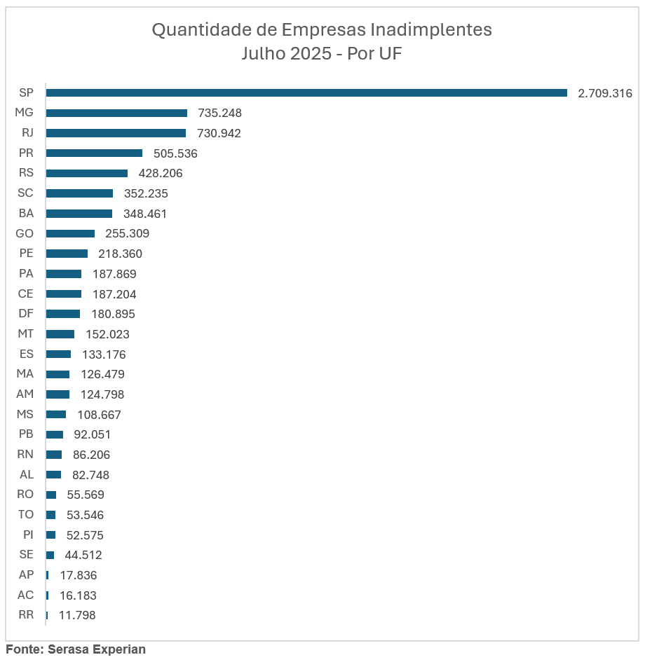 A maioria das dívidas foi contraída no segmento de Serviços (31,8%), seguido por Bancos e Cartões (19,8%). Em números absolutos, a região Sudeste concentrou o maior volume de empresas inadimplentes (4,1 milhões), seguida pela região Sul (1,2 milhão).