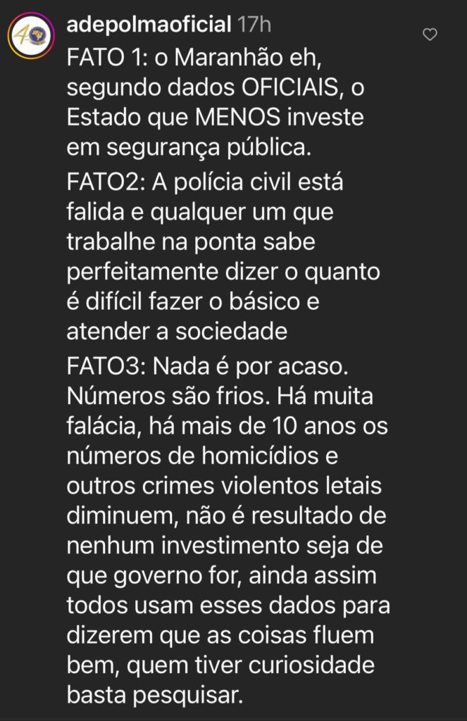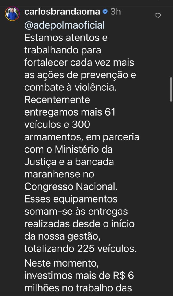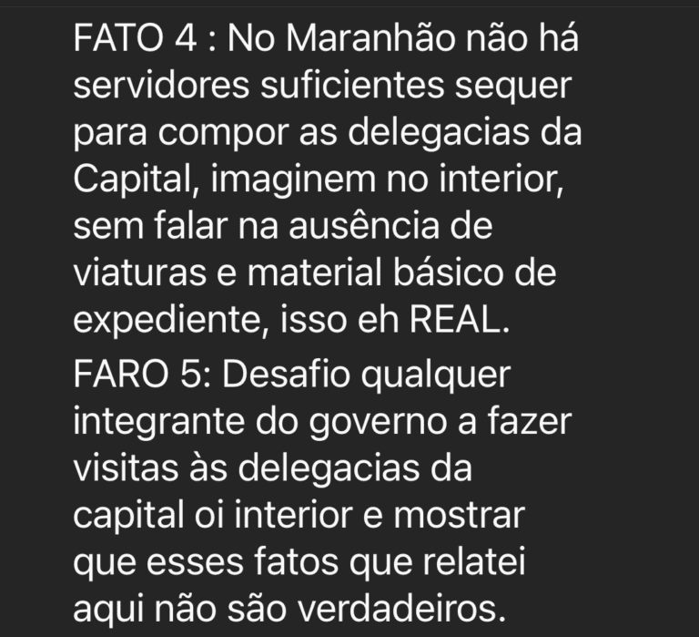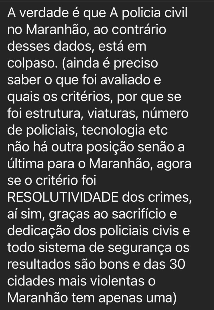 A divulgação dos números do Ranking de Competitividade dos Estados pelo governador Carlos Brandão (PSB), que indicaram avanços nos índices de segurança pública no Maranhão, gerou controvérsia. A Associação dos Delegados de Polícia Civil do Maranhão (Adepol/MA) expressou descrença nos números em comentário na publicação.