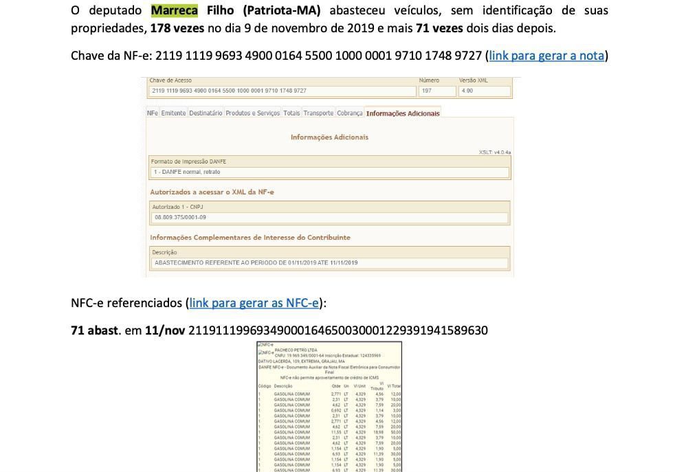 Protagonista da Operação Tanque Furado, após matéria do Fantástico no último domingo, o deputado federal Marreca Filho (Patriota) abasteceu 178 vezes no dia 09 de novembro de 2019 e 71 vezes dois dias depois.