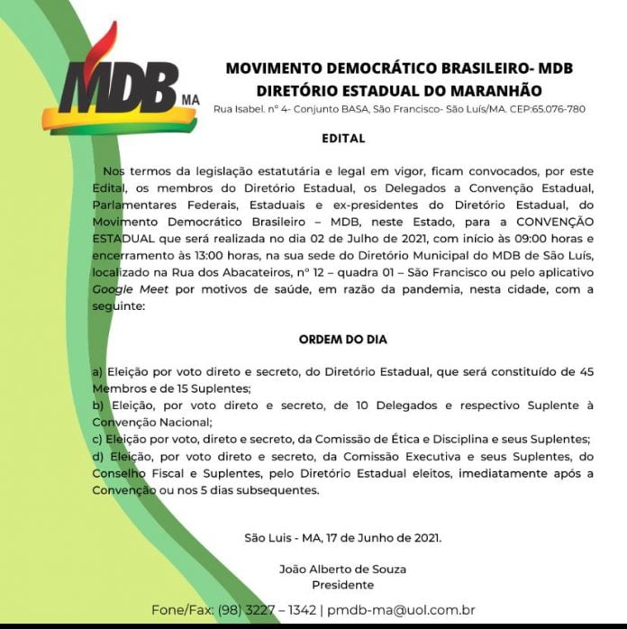 O diretório estadual do Movimento Democrático Brasileiro (MDB), por meio do ex-senador João Alberto, marcou para sexta feira da próxima semana, isto é, 02 de julho, a data de convenção do partido.