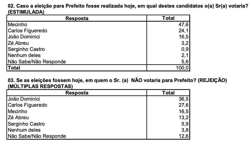 Ele aparece no levantamento com 47,6% das intenções de votos, mais 20 pontos à frente do segundo colocado, Carlos Carlos Figueiredo, que tem apenas 24,1%.