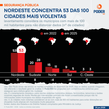 BRASIL, 26 de janeiro de 2026 – O Nordeste se manteve em 2025 como a região mais perigosa do Brasil. Concentra 53 das 100 cidades com mais mortes violentas do país. Esse número se manteve o mesmo desde 2022, quando houve a última eleição para governador.