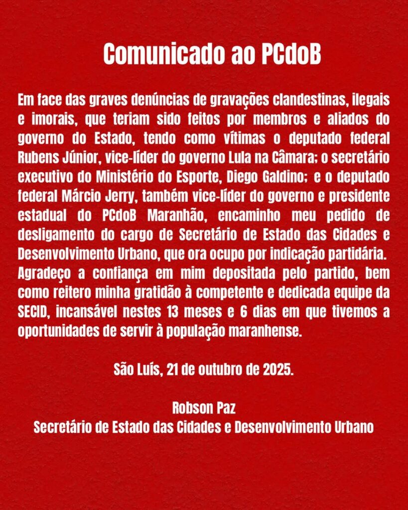 Em nota divulgada nas redes sociais, Robson justificou sua decisão diante das “graves denúncias de gravações clandestinas, ilegais e imorais”, supostamente feitas por membros e aliados do governo estadual contra os deputados Rubens Pereira Júnior (PT) e Márcio Jerry (PCdoB), além do secretário-executivo do Ministério do Turismo, Diego Galdino.