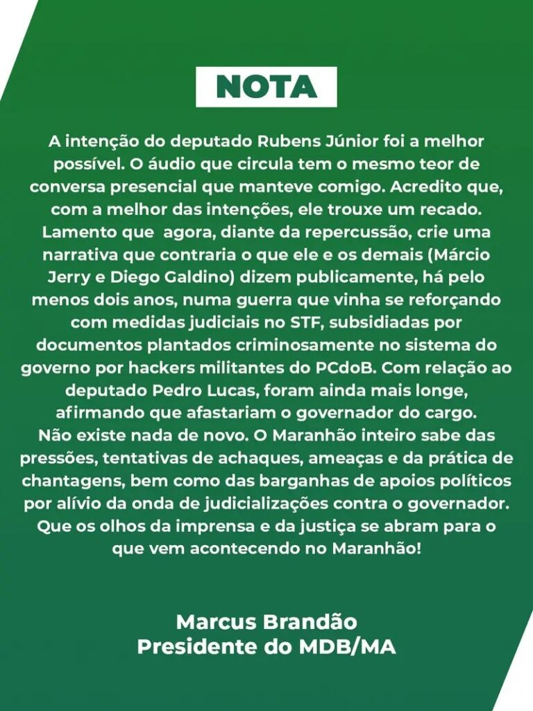 No mesmo dia, o presidente estadual do MDB, Marcus Brandão, irmão do governador Carlos Brandão, divulgou uma nota em resposta ao discurso do deputado federal Rubens Júnior (PT).