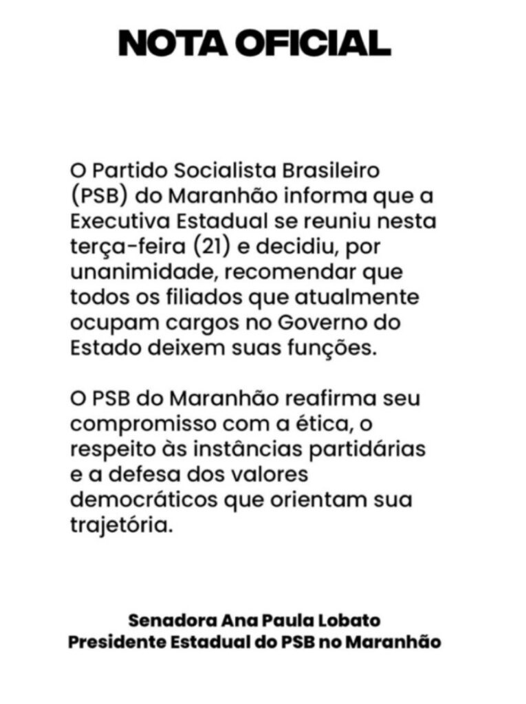 MARANHÃO, 22 de outubro de 2025 –O Partido Socialista Brasileiro (PSB) do Maranhão anunciou, na terça (21), uma decisão unânime da Executiva Estadual recomendando que todos os filiados que ocupam cargos no Governo Brandão deixem suas funções. A nota foi assinada pela senadora Ana Paula Lobato, presidente estadual do PSB,