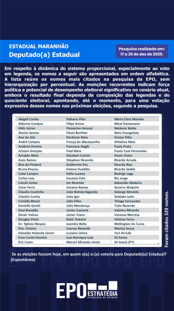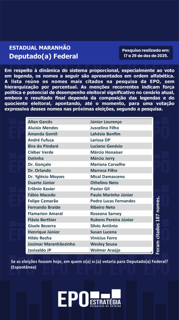 SÃO LUÍS, 31 de dezembro de 2025 – Uma pesquisa eleitoral no Maranhão identificou os nomes mais citados espontaneamente pelos eleitores para os cargos de deputado federal e deputado estadual. O Instituto EPO realizou o levantamento entre 17 e 29 de dezembro de 2025, ouvindo 16.768 pessoas em todo o estado.