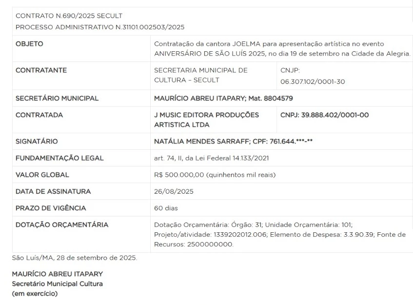 O secretário municipal de Cultura em exercício, Maurício Abreu Itapary, assinou o documento, que estabelece o valor global de R$ 500 mil. Conforme o registro, os recursos serão destinados exclusivamente à apresentação da cantora Joelma na programação oficial do aniversário da cidade.